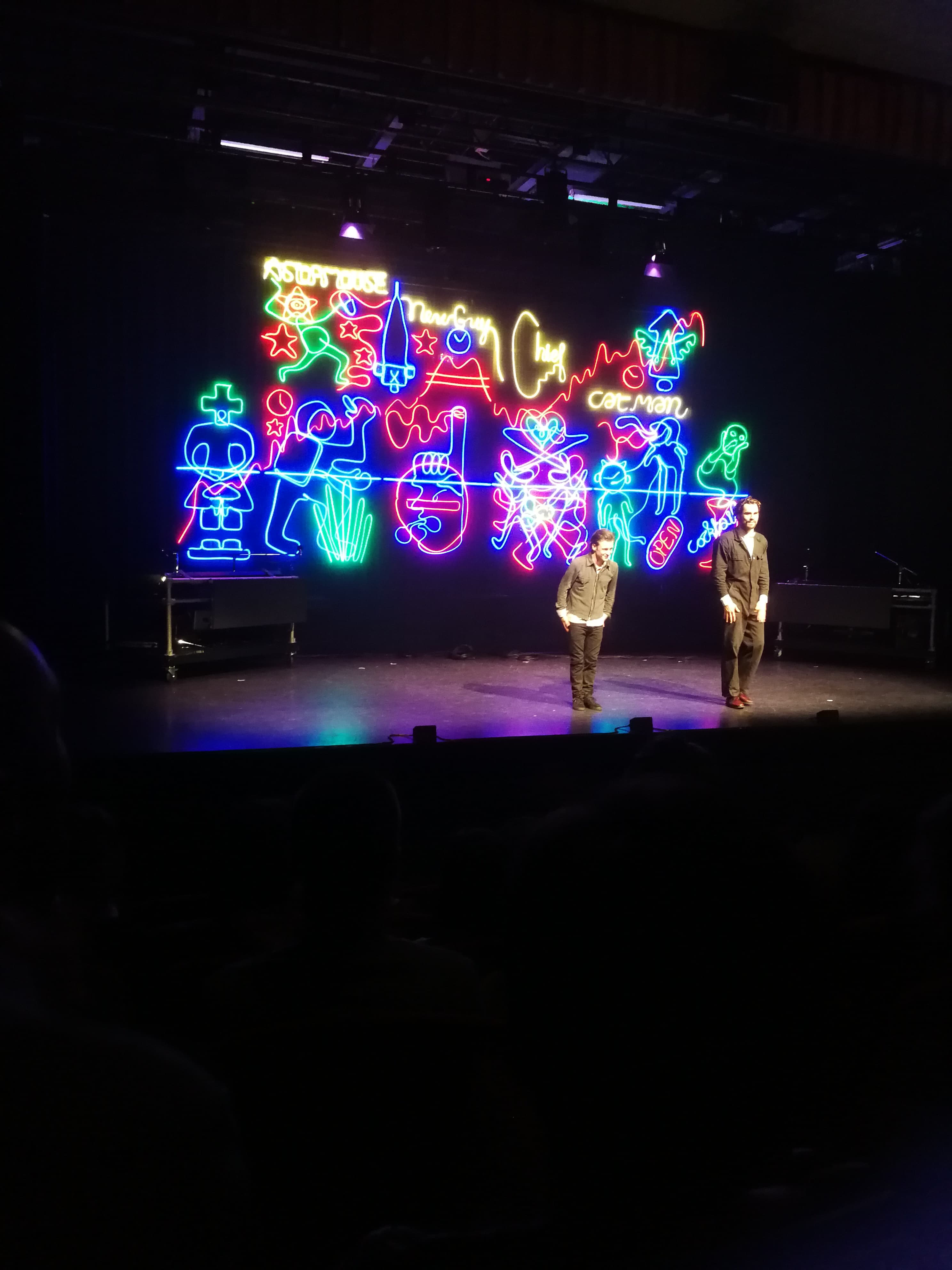 De volledige show, met tal van dialogen en monologen, werd ondersteund door een spectaculair staaltje techniek. Achteraan op het podium was een muur opgebouwd met een uitrusting van verschillende soorten tl-verlichting. Zo gaat er telkens voor elk personage dat aan bod komt een licht branden. Ook locaties en situaties worden hiermee verduidelijkt. Bijvoorbeeld tijdens een ruzie gaan twee figuren aan en kleuren hevig rood en blauw door elkaar, terwijl ze tijdens het heftig dialoog pinken. Wanneer deze twee het bijleggen en in vrede terug samenkomen, kleuren ze rustig rood naast elkaar.