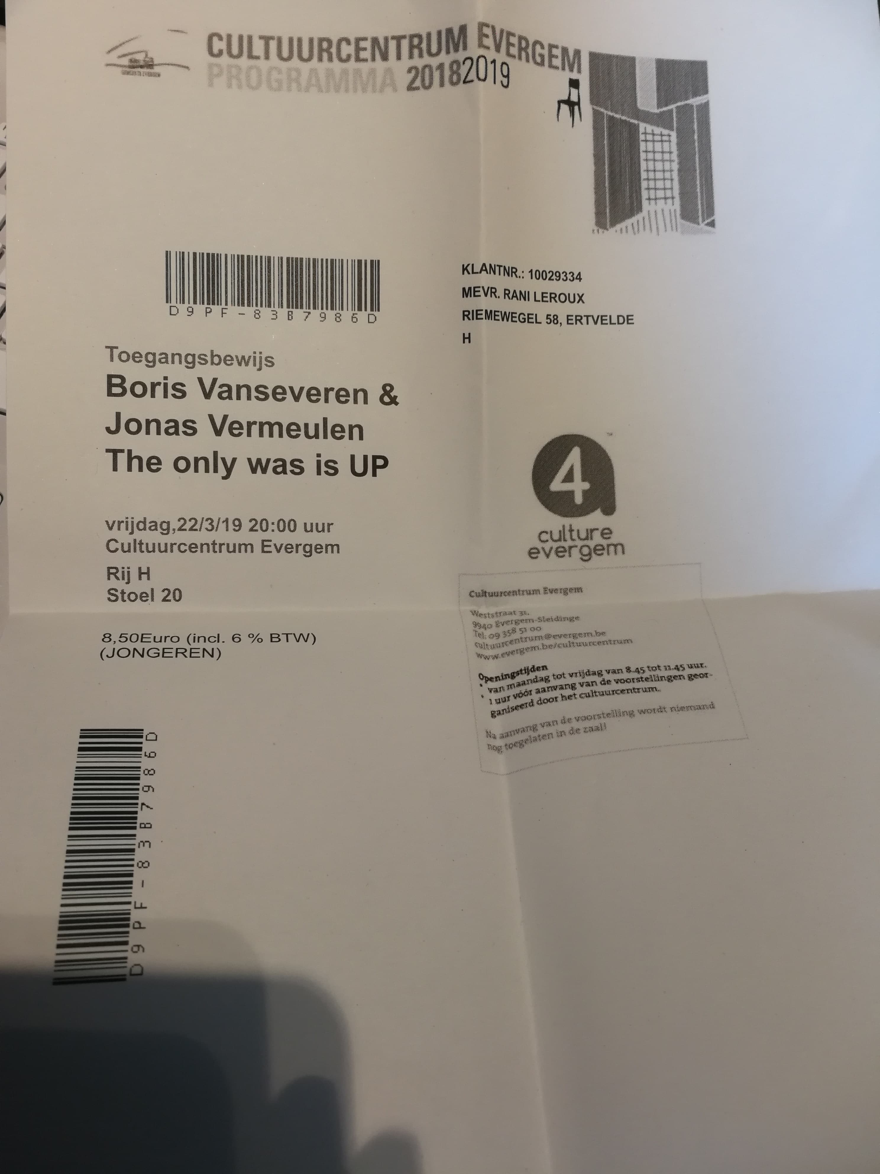 Omdat theater wel meer mijn ding is, wou ik ook hierin zeker een uitdaging. Het oog viel op de voorstelling van Boris Van Severen en Jonas Vermeulen met hun “The only way is up”. Een alles behalve standaard klassieke theaterstuk.